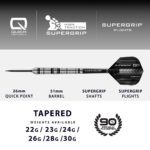 Jeder Barrel ist mit einer Toleranz von nur +/- 0,05g gewichtsgenau abgestimmt, was für höchste Gleichmäßigkeit und Zuverlässigkeit sorgt. Die natürliche Wolfram-Oberfläche wird durch matte schwarze Ringe und das ikonische Supergrip-Logo ergänzt – ein eleganter und funktionaler Look für die Dartscheibe.