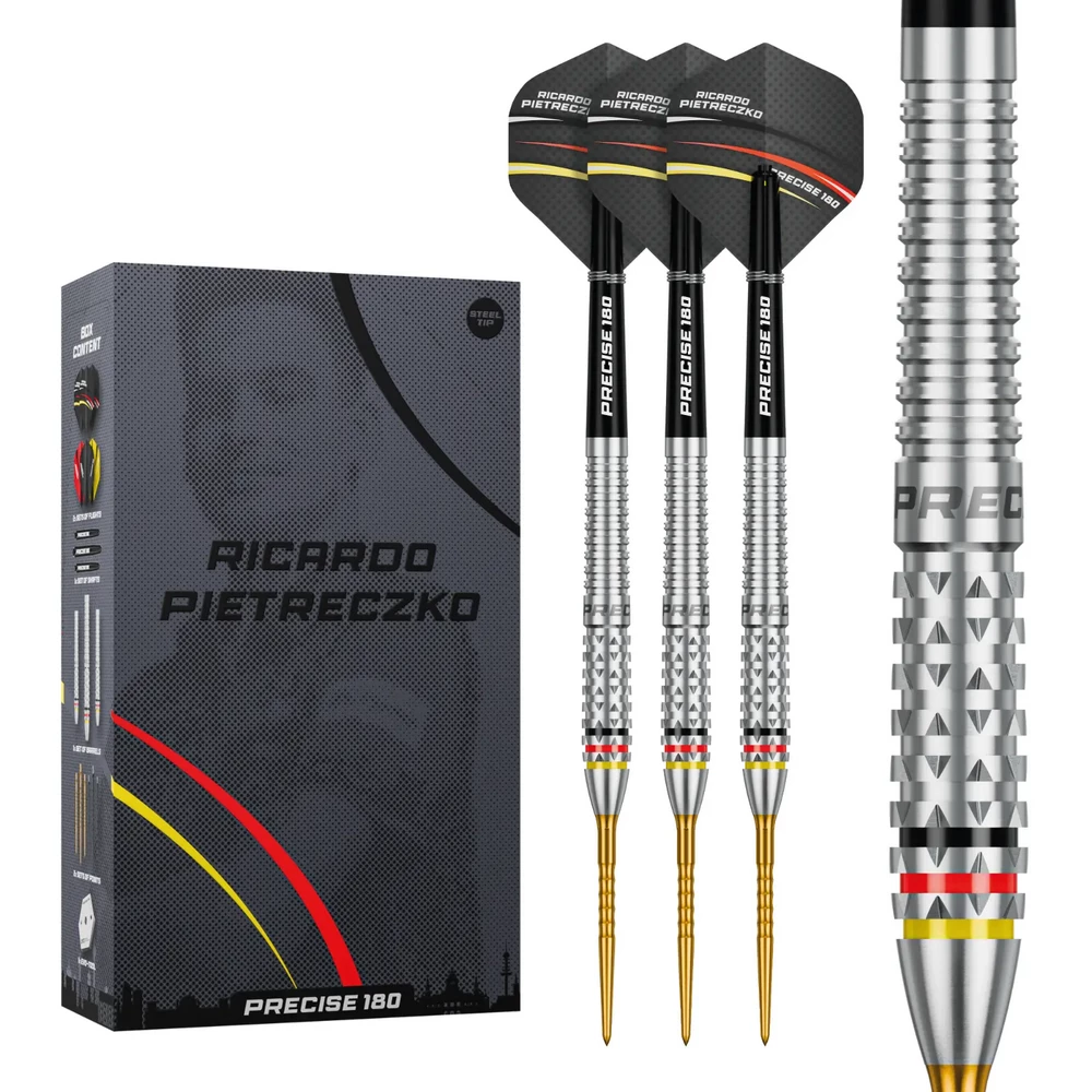Der Precise180 Ricardo Pietreczko Steel‑Tip wurde gemeinsam mit „Pikachu“ entwickelt und bringt seine typische Spielweise perfekt auf den Punkt. Das tropfenförmige Barrel sorgt für eine klare Führung im Wurf und unterstützt den kopflastigen Schwerpunkt, der für einen direkten, stabilen Flug steht.
