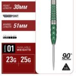 Barrelform – Fronttaper für schnelle Beschleunigung Das Barrel besitzt ein nach vorne zulaufendes Profil, das eine besonders flüssige und schnelle Flugbahn ermöglicht. Diese Form unterstützt dynamische Würfe und sorgt für ein direktes, präzises Gefühl.