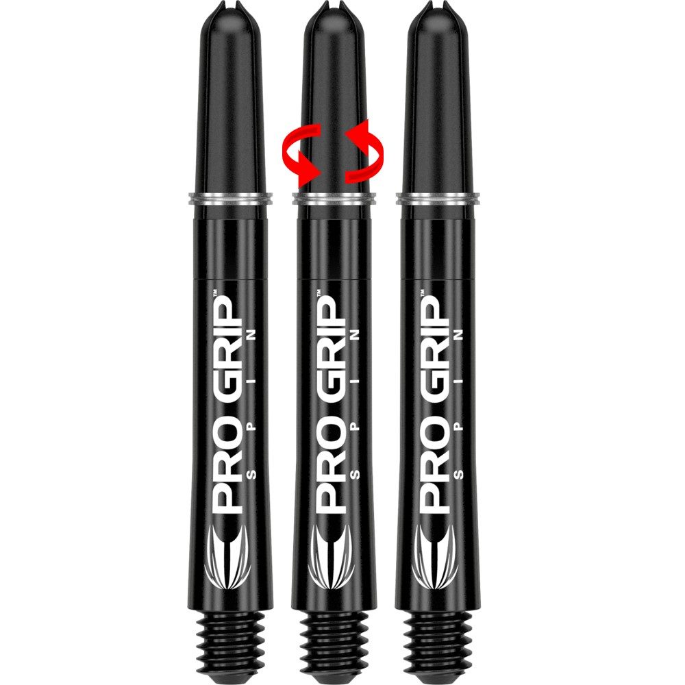 Target Pro Grip Spin Shafts in der Farbe Schwarz mit einem rotierenden Top. Die abgebildeten Shaftringe sind inkludiert. Erhältlich in den Längen 34 mm, 41 mm und 48 mm.
